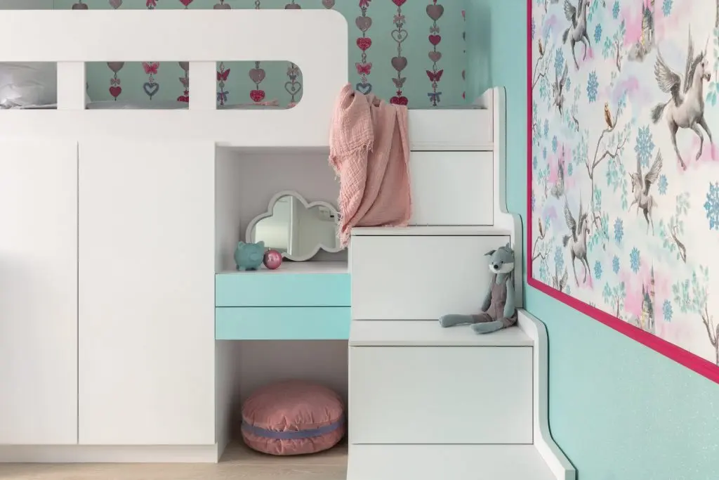 In dormitorul copiilor, initial livingul, pe un fundal preponderent alb s-au introdus nuante de turcoaz si roz, atat in pereti cat si in accesoriile existente. Zonele de depozitare sunt multiple si ofera atat loc pentru haine, cat si pentru jucarii. Pentru activitatile de zi cu zi si lectura s-a pus accent pe lumina naturala, care reuseste sa ajunga in fiecare colt al camerei.