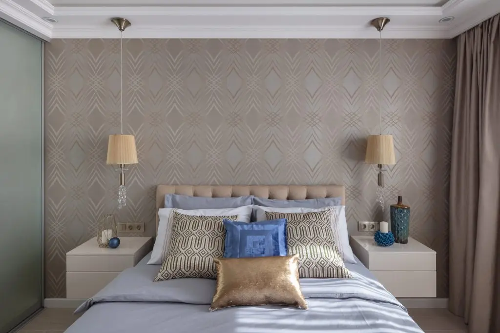 Dormitorul matrimonial inspira eleganta si rafinament. Patul este pozitionat central iar intr-o reusita simetrie se alatura doua noptiere si doua veioze. Tapetul cu detalii aurii reuseste sa aduca interes si o nota feminina. Langa fereastra s-a reusit si integrare unei zone de make-up.