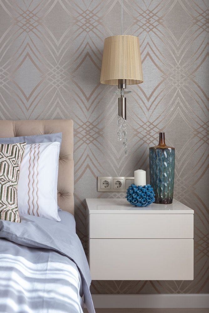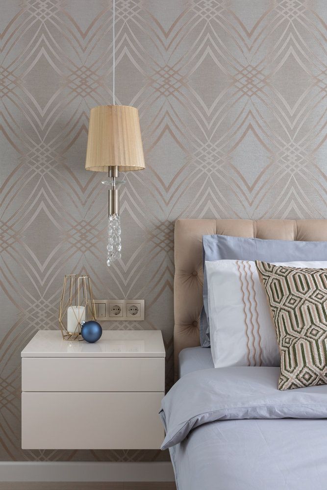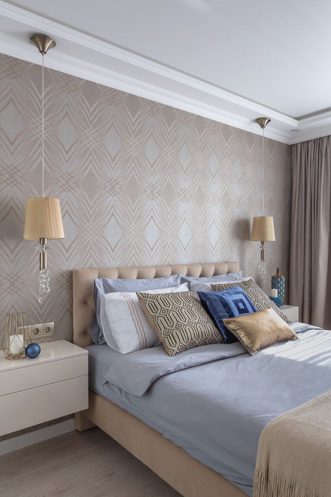 Dormitorul matrimonial inspira eleganta si rafinament. Patul este pozitionat central iar intr-o reusita simetrie se alatura doua noptiere si doua veioze. Tapetul cu detalii aurii reuseste sa aduca interes si o nota feminina. Langa fereastra s-a reusit si integrare unei zone de make-up.