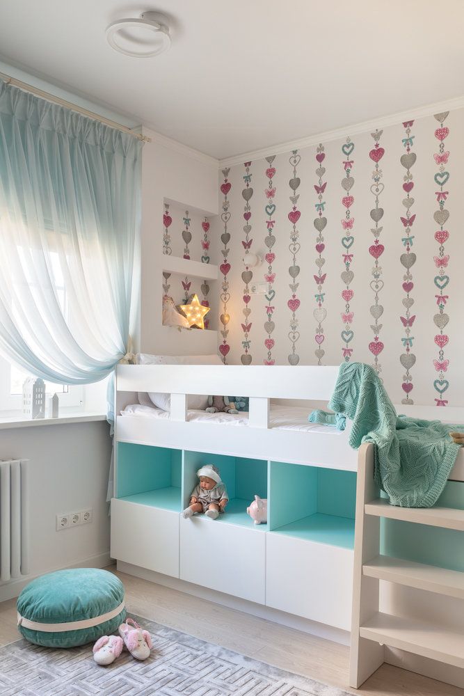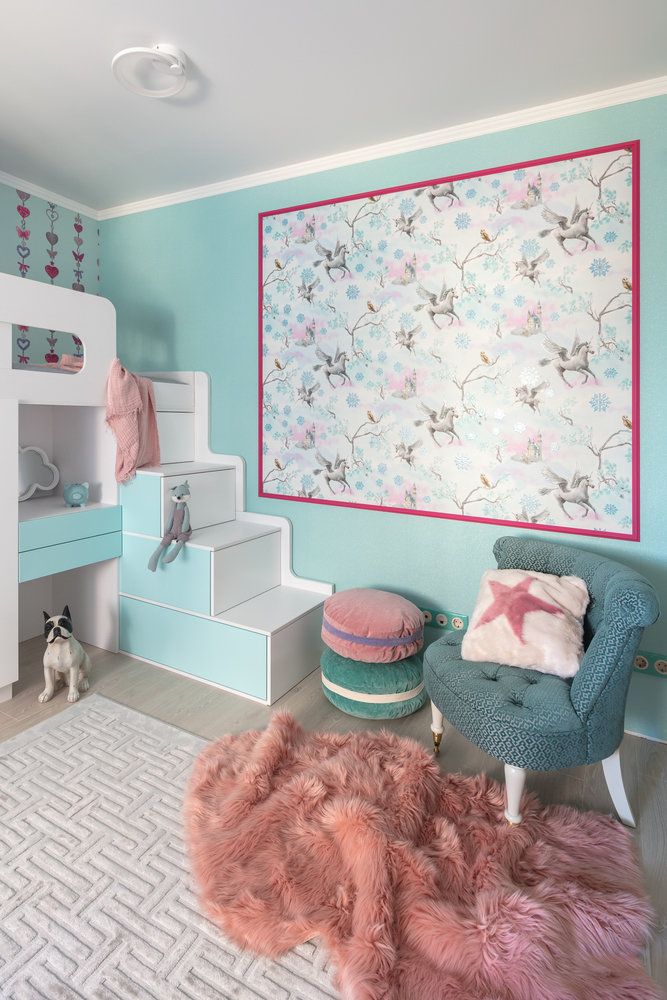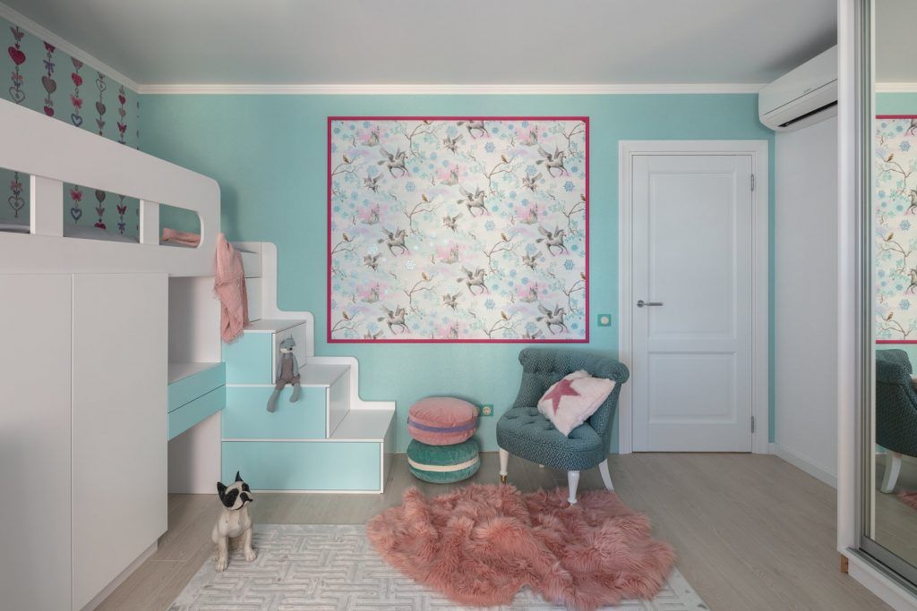 In dormitorul copiilor, initial livingul, pe un fundal preponderent alb s-au introdus nuante de turcoaz si roz, atat in pereti cat si in accesoriile existente. Zonele de depozitare sunt multiple si ofera atat loc pentru haine, cat si pentru jucarii. Pentru activitatile de zi cu zi si lectura s-a pus accent pe lumina naturala, care reuseste sa ajunga in fiecare colt al camerei.