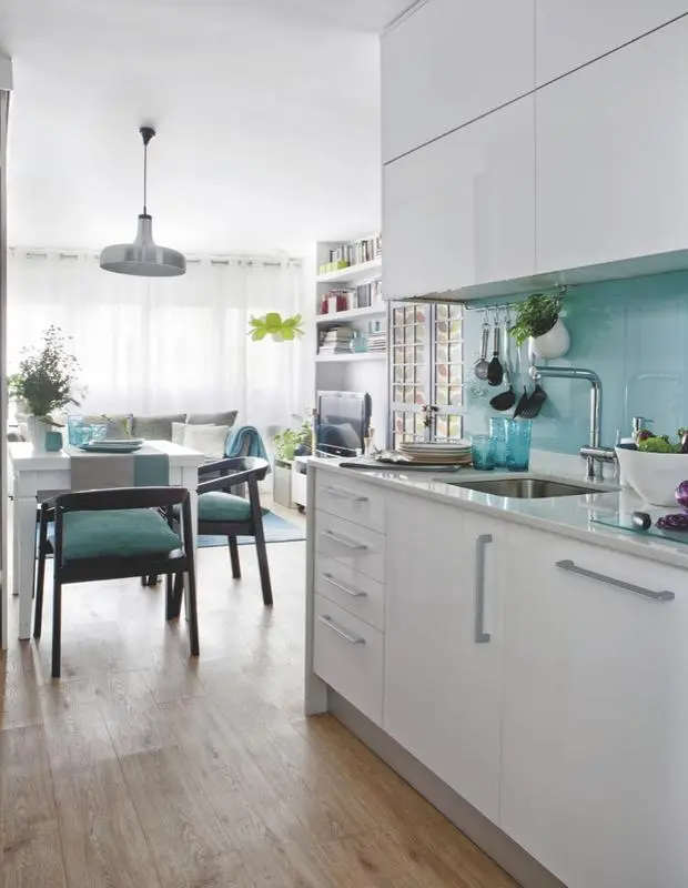 Ca paleta cromatica albul predomina combinat pe alocuri cu accente de negru si albastru acvamarin. Aceleasi culori se repeta si in bucatarie in varianta unui verde jad care evidenteaza mobila alba, lacuita.