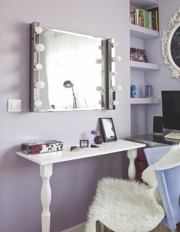 In dormitor predomina tonuri linistitoare de lavanda. Intalnim aici o idee ingenioasa de a castiga spatiu suplimentar: un dulap cu spatiu in partea de jos unde este ascunsa o jumatate de pat care in timpul zilei poate fi utilizata ca o sofa. Un mini-budoar improvizat dintr-o etajera si doua picioare ofera un aer chic impreuna cu oglinda cu lumini.