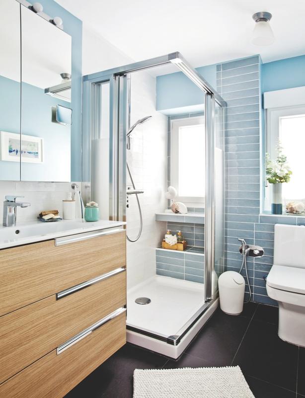 In baie, s-a optat pentru o cabina de dus din aceleasi motive de spatialitate. Un lavoar generos cu sertare ofera suport pentru depozitare, iar culoarea, un bleu azul relaxant contureaza ceea ce numim in timpul prezent un sanctuar al placerii.