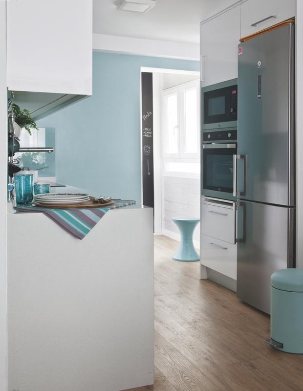 Ca paleta cromatica albul predomina combinat pe alocuri cu accente de negru si albastru acvamarin. Aceleasi culori se repeta si in bucatarie in varianta unui verde jad care evidenteaza mobila alba, lacuita.