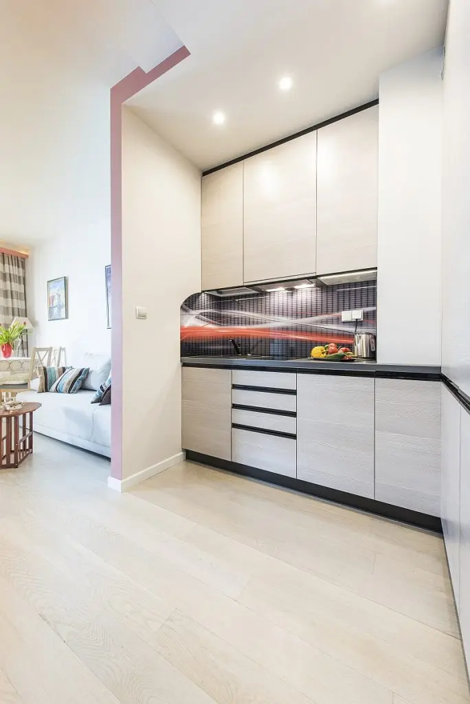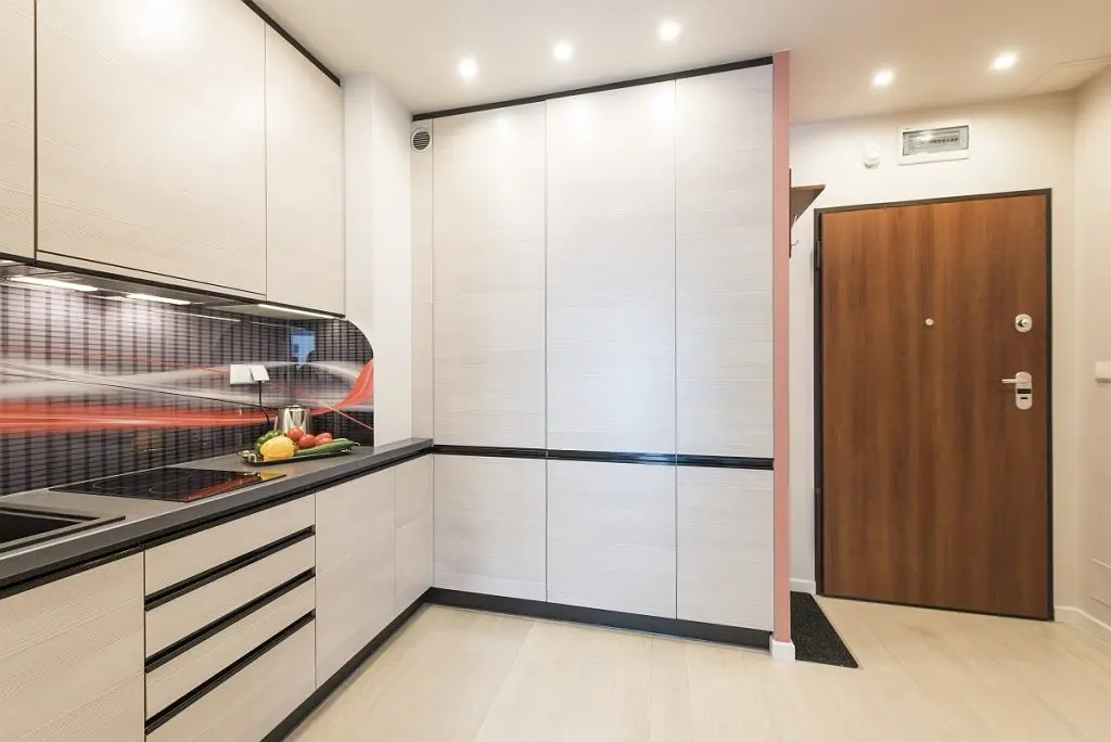 Bucataria compacta a fost dotata cu strictul necesar, cu un rand de dulapuri in zona superioara si o multitudine de spatii de depozitare incastrate.