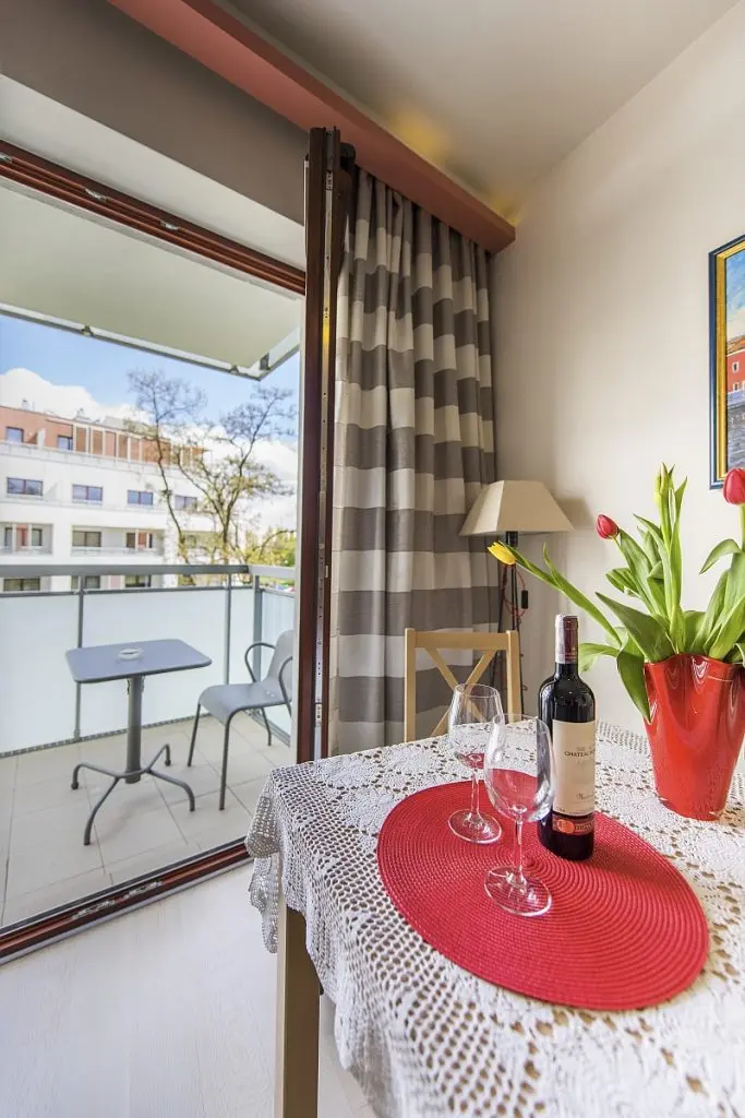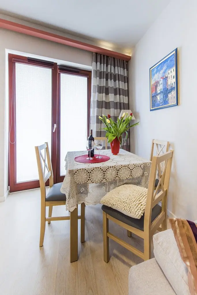 Totul a fost excelent de bine optimizat, cu o zona pentru luat masa integrata in living si o alta pe balcon.