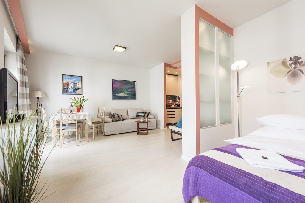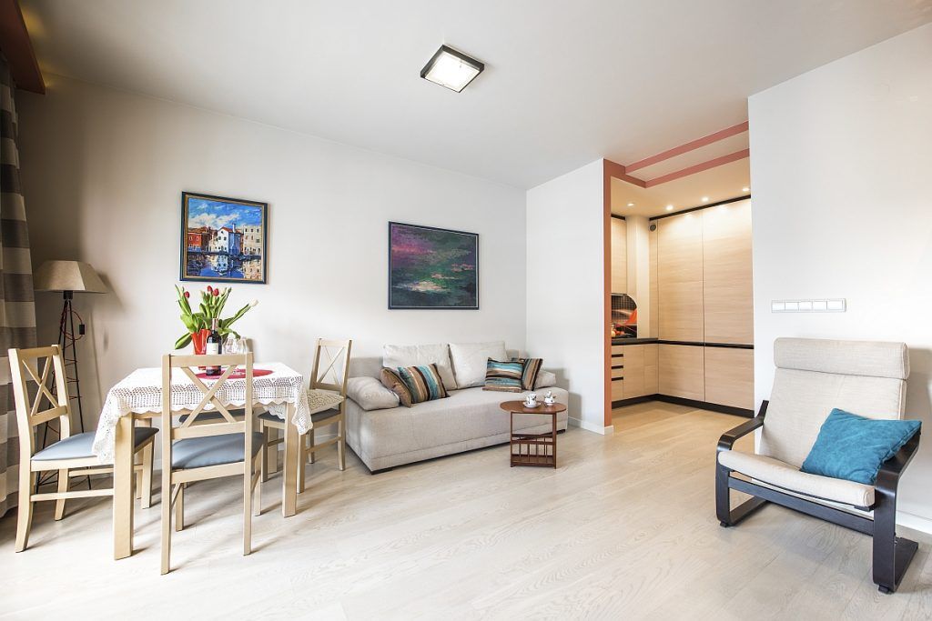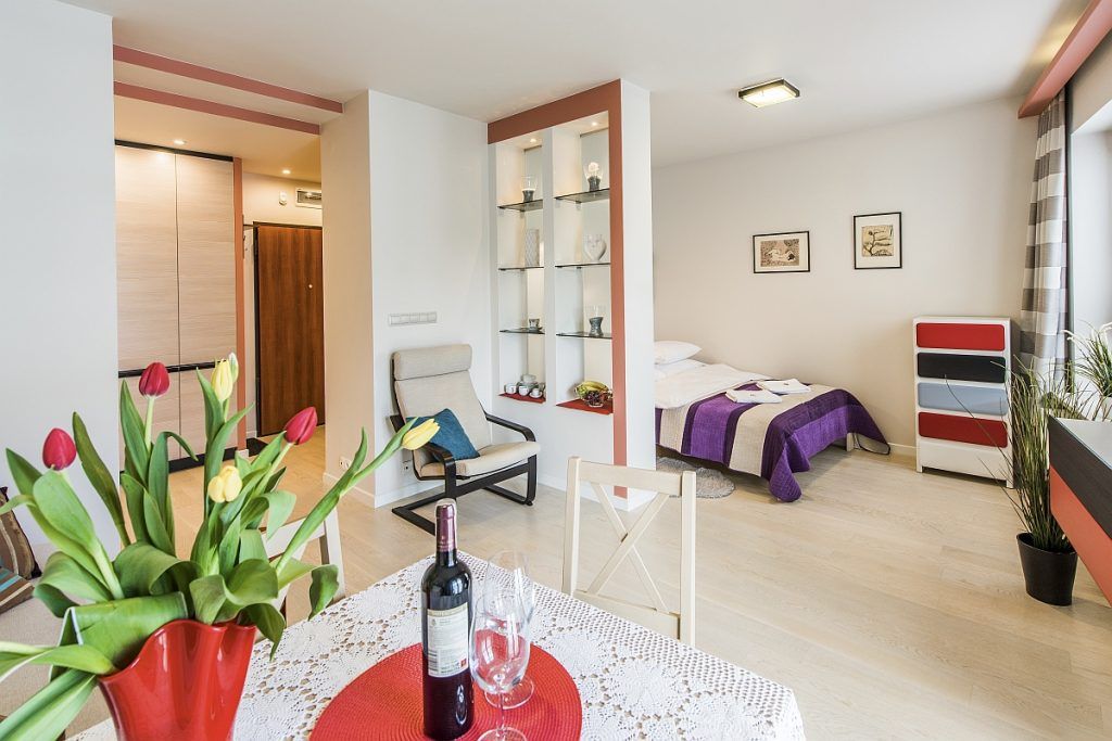 Deschide GaleriaApartamentul de 27 metri patrati se afla intr-un imobil din Varsovia. Probabil vei fi atras(a) de atmosfera de vacanta a acestei locuinte, insa detaliul care face acest spatiu si mai special este amenajarea unui dormitor printr-o delimitare foarte ingenioasa de zona de zi. Astfel, spatiul mic beneficiaza de toate zonele functionale necesare unei locuinte in care isi petrece timpul o persoana tanara, cu un stil de viata activ.