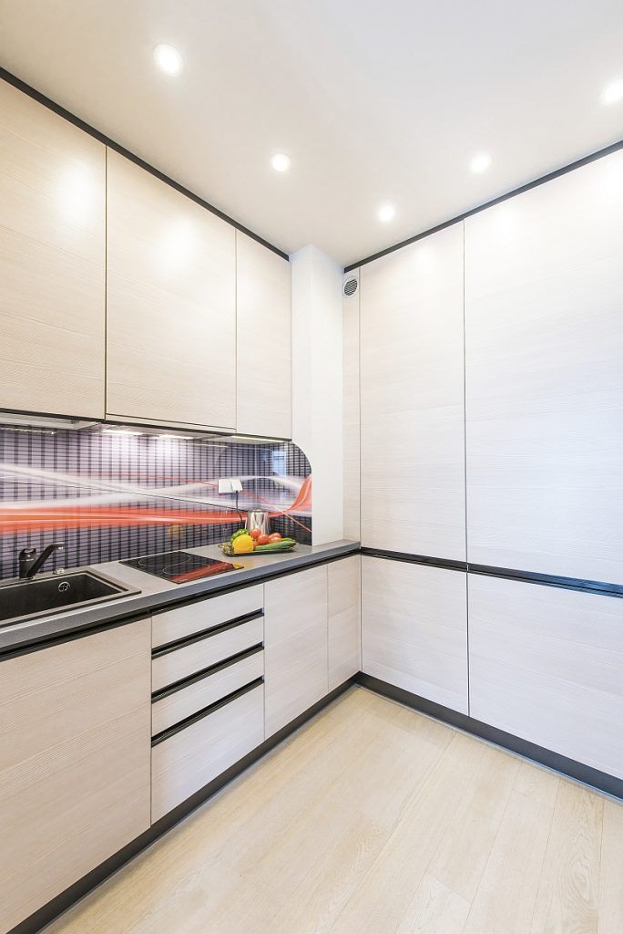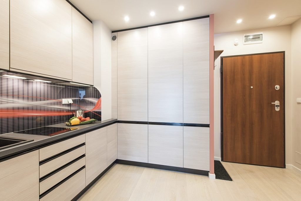 Bucataria compacta a fost dotata cu strictul necesar, cu un rand de dulapuri in zona superioara si o multitudine de spatii de depozitare incastrate.