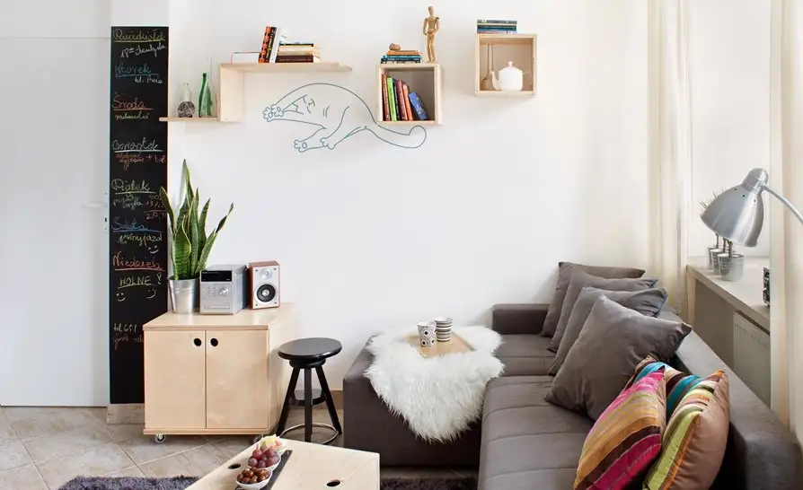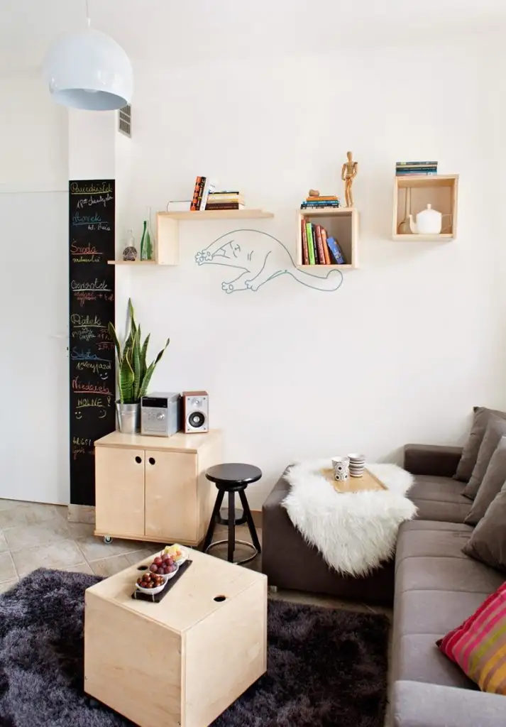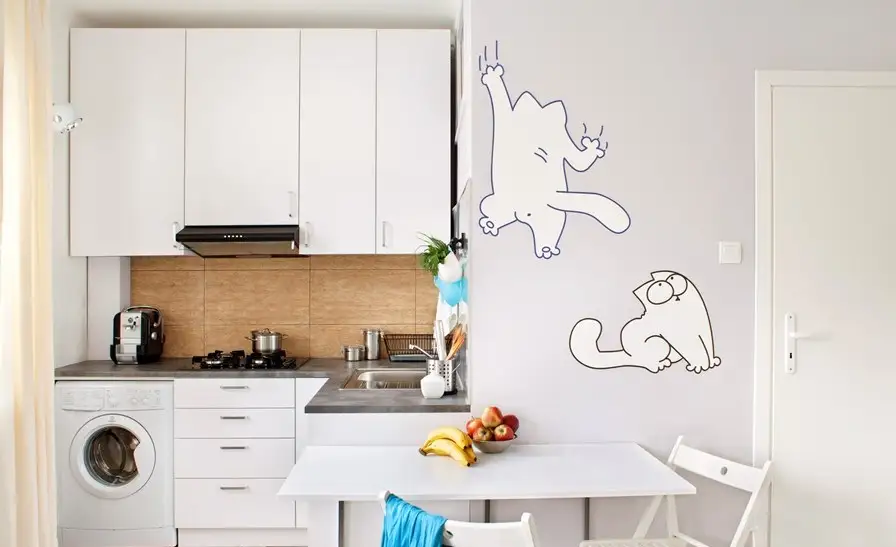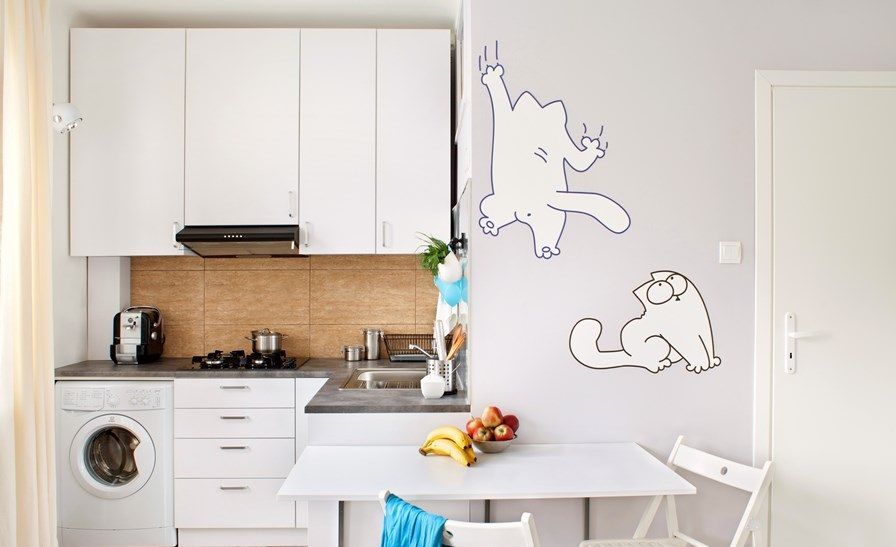 Dar farmecul acestei amenajari sta in stickerele cu pisici ce decoreaza peretii camerelor. Vei recunoaste poate personajul simpatic din seria animata, Simon’s cat, care aduce o nota haioasa spatiului. Si tu poti integra astfel de stickere, in functie de preferintele tale. Merg de minune in camera copiilor sau in bucatarie, cu tematica specifica.