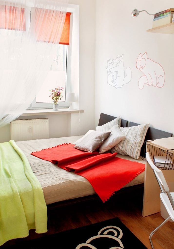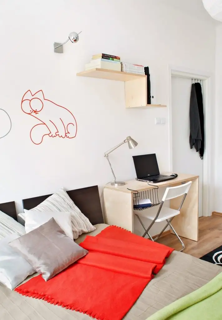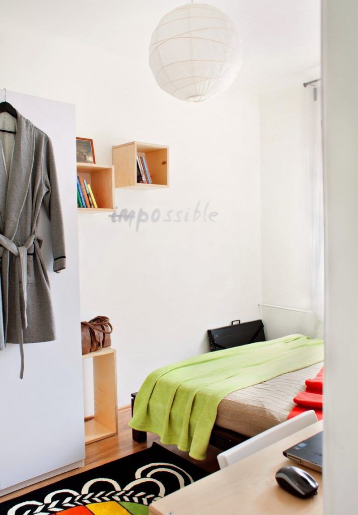 Pentru dormitor, designerul a gandit amenajarea in linii simple cu pat, dulap, ba chiar si cu un mic birou. Tusele de culoare de la nivelul decoratiunilor si accesoriilor inveselesc decorul. Si pentru baie s-a mers pe acelasi principiu, optimizand fiecare detaliu, de la lavoarul suspendat, pana la cabina de dus.