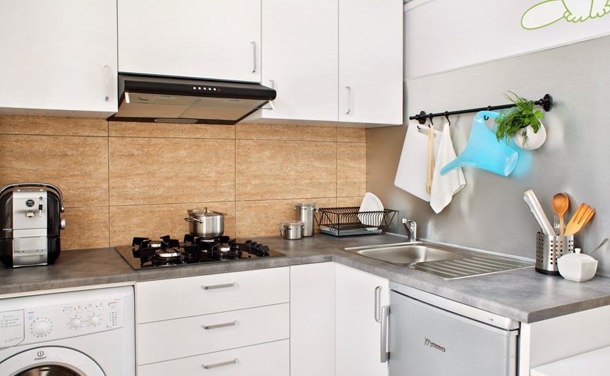 Pe cat de mic acest spatiu, pe atat de bine gandit. Sa luam de exemplu, mica bucatarie. Aici, mobilierul compact, simplu, alb, incorporeaza si un frigider (mic, ce-i drept), si masina de spalat rufe, si plita, si hota. Imediat langa, o masuta pliabila cu doua scaune asigura locul de luat masa. Cand nu este folosita, si masa si scaunele sunt stranse pentru a elibera spatiul.