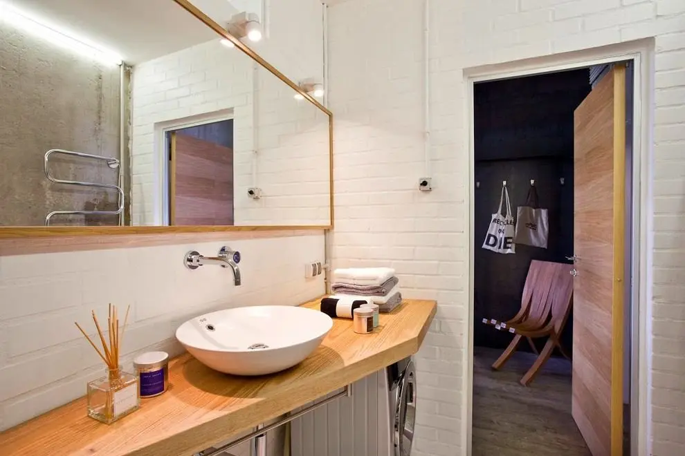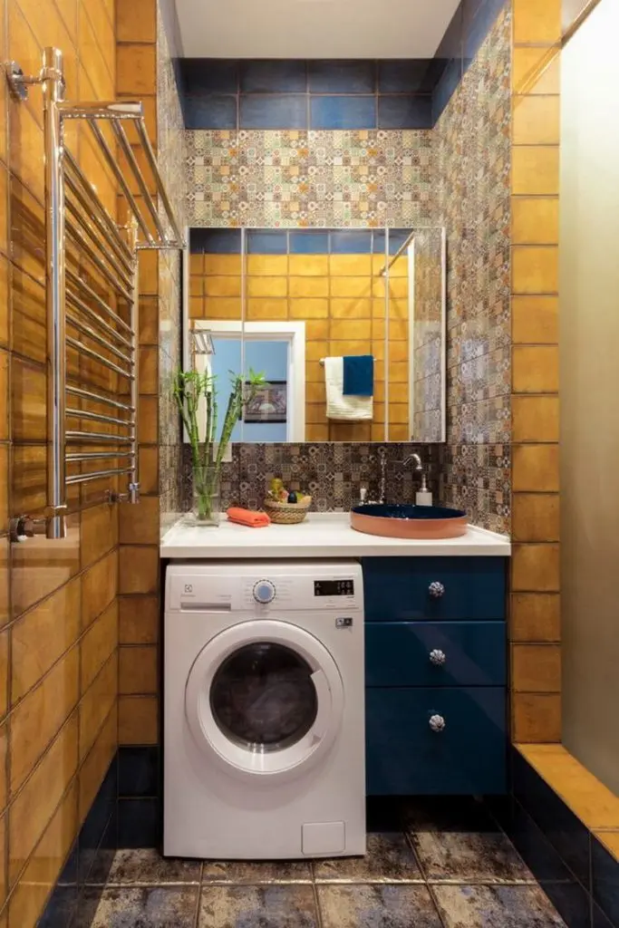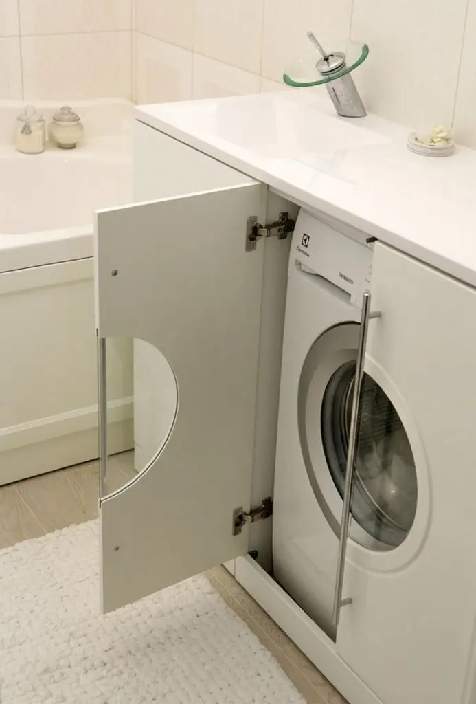 In cazul in care nu poti ajusta inaltimea lavoarului la cea a masinii, asaza masina in imediata apropiere. Poate fi lasata de sine statatoare sau integrata intr-un corp tip nisa. Daca nu iti doresti sa fie vizibila, o poti inchide intr-un dulap realizat la comanda pe masurile masinii sau cu un simplu rulou precum cele folosite la exteriorul ferestrelor. Instaland deasupra masinii cateva rafturi iti vei asigura mai mult loc pentru depozitarea detergentilor sau chiar a rufelor murdare.