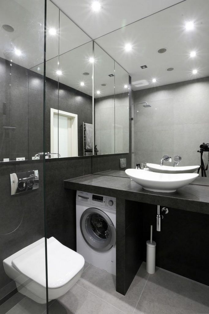 Dar unde putem instala mai exact masina de spalat? Una din variantele pe care ti le propunem este chiar sub lavoar, eventual sub un blat comun cu un dulap sau sertarele folosite pentru depozitare. Ca sa faci o separare vizibila poti opta pentru o partitie suplimentara astfel incat sa delimitezi clar cele doua zone.