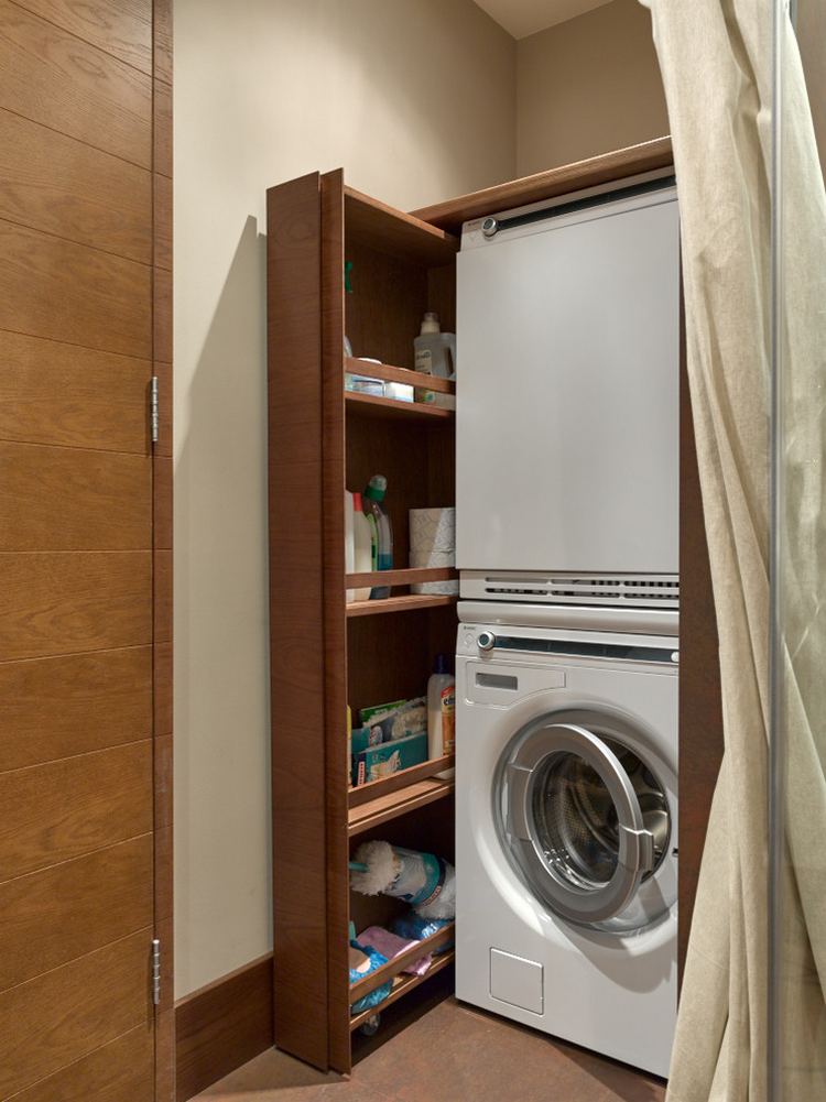 Intr-o nisa poti incastra atat masina de spalat rufe, cat si uscatorul de rufe automat. In functie de spatiu poate fi in baie sau in apropierea baii, pe hol. Tot aici, ia in calcul un corp tip Jolly culisant pe care sa-l folosesti ca suport pentru detergenti si alte produse utile.