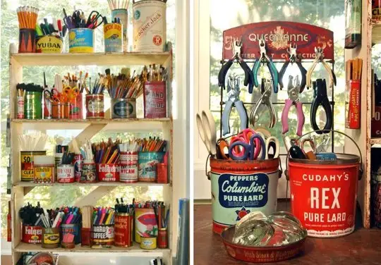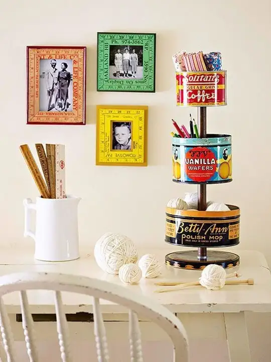 Ati terminat de curand o cutie cu bomboane sau biscuiti? Pastrati-o si integrati-o in biroul dumneavoastra. Va fi un suport ideal pentru creioane, radiere, rigle, pensule sau orice alte obiecte necesare muncii dumneavoastra. Aplicati-le un magnet si le puteti lipi de perete sau de frigider ca suport de notite.