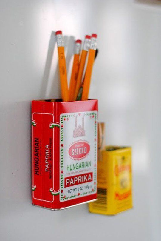 Ati terminat de curand o cutie cu bomboane sau biscuiti? Pastrati-o si integrati-o in biroul dumneavoastra. Va fi un suport ideal pentru creioane, radiere, rigle, pensule sau orice alte obiecte necesare muncii dumneavoastra. Aplicati-le un magnet si le puteti lipi de perete sau de frigider ca suport de notite.