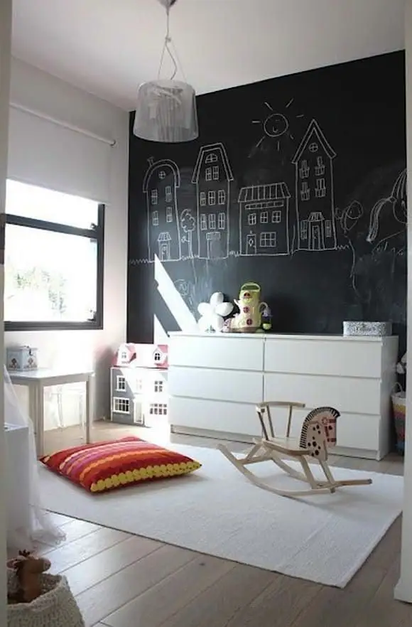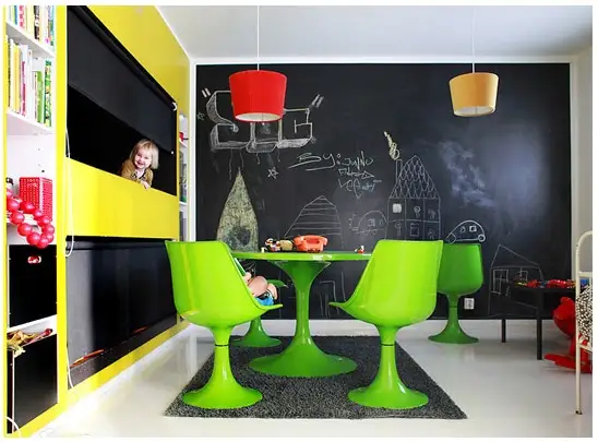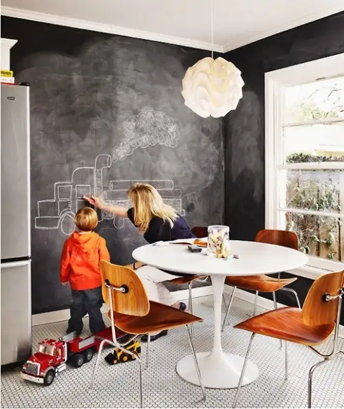 Asadar, un perete vopsit in tabla scolara sau o zona inalta de 1 metru de la podea pe toti peretii poate sa va usureze munca de zi cu zi, iar cel mic poate desena in voie cu creta colorata dupa cat ii pofteste inima.