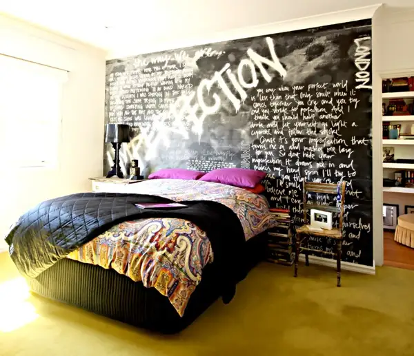 Peretele pe care aveti amplasat patul in dormitor este si el un loc bun pentru a integra acest material in designul interior. Renuntati la clasica tablie de pat si desenati in fiecare saptamana una noua direct pe perete si nu uitati sa lasati dimineata un mesaj frumos pentru jumatatea dumneavoastra.