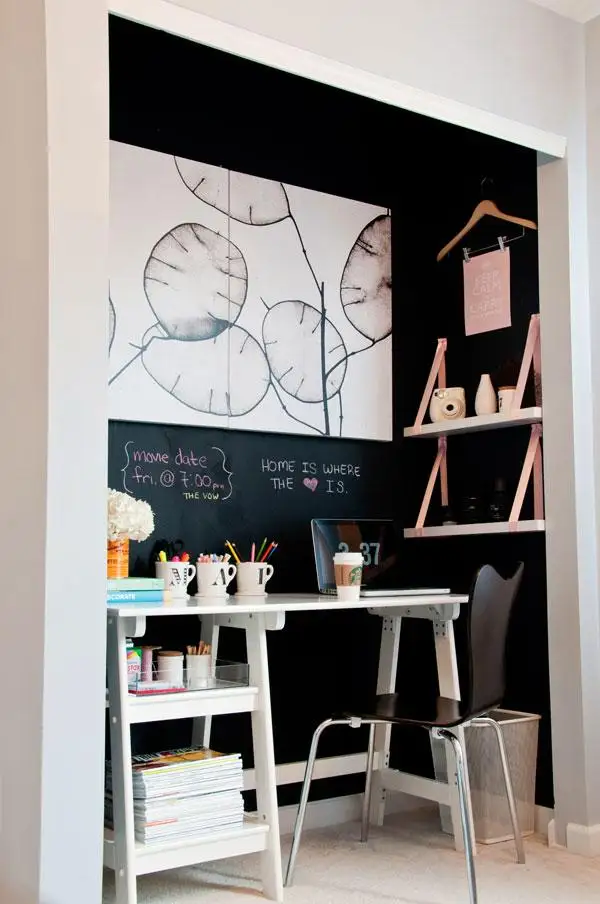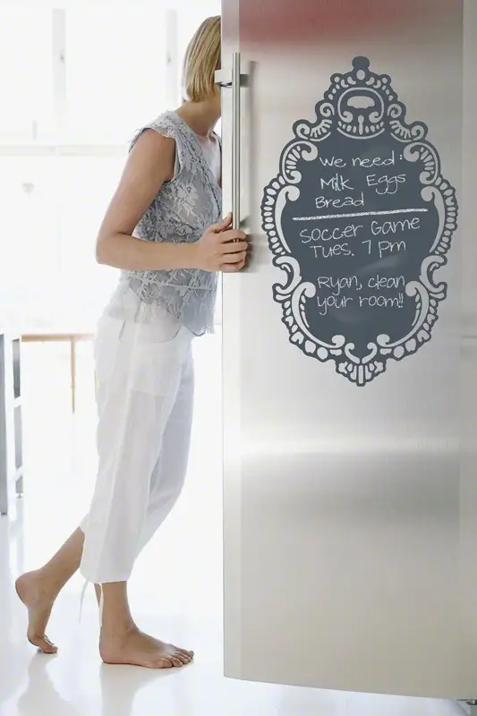 Bucataria este si ea un spatiu in care vopseaua de tabla scolara se simte ca la ea acasa. Incercati sa realizati aici un joc frumos intre alb si negru si folositi zona acoperita cu aceasta vopsea pentru a va nota retete, liste de cumparaturi sau sa lasati mesaje dragute membrilor familiei.