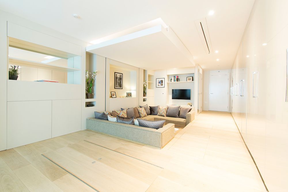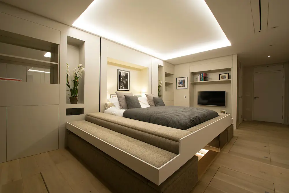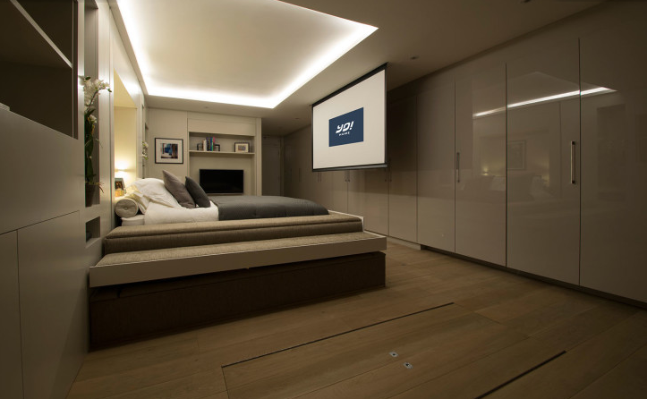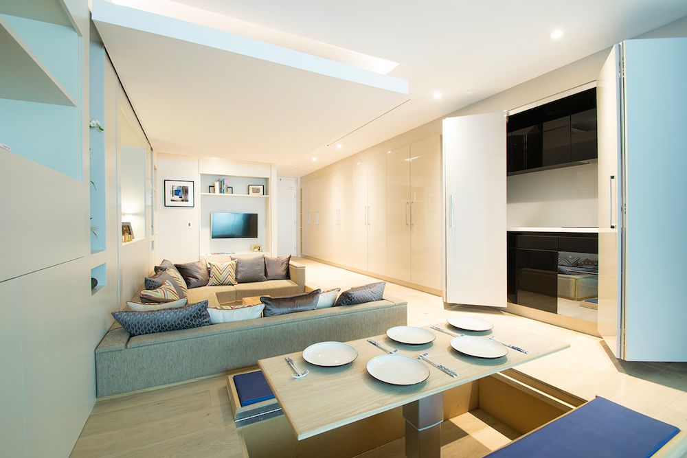 In acest apartament care are in principiu o singura camera, paturile, mesele şi alte obiecte de mobilier sunt ascunse in pereti si se pot schimba intre ele, prin simpla apasare a unui buton.