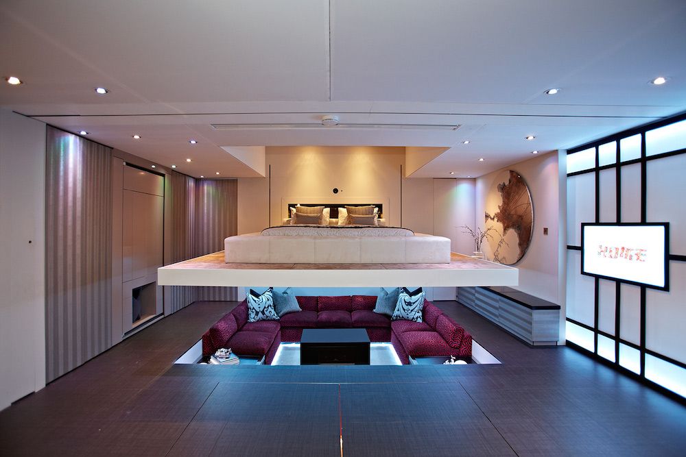 Astfel, intr-o camera cu o suprafata de doar 80 de metri patrati au fost incorportare functii specifice dormitorului, livingului, bucatariei si biroului. Un dormitor matrimonial poate fi coborat peste zona de relaxare care este situata putin sub nivelul podelei, astfel incat cele doua zone sa se imbine perfect.